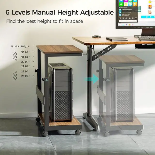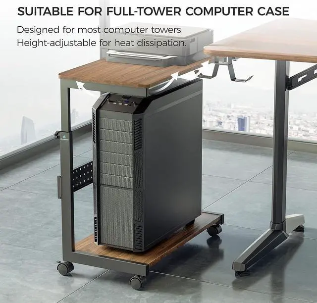 Height Adjustable Tower Stand: Unique manual height adjustable range from 23 1/4' ' to 33 1/4' ' allows you to store tower under your desk or next to your table, support most computer cases on the market including full size ATX case. Customize height to increase distance between the computer tower and top shelf to speed up heat dissipation