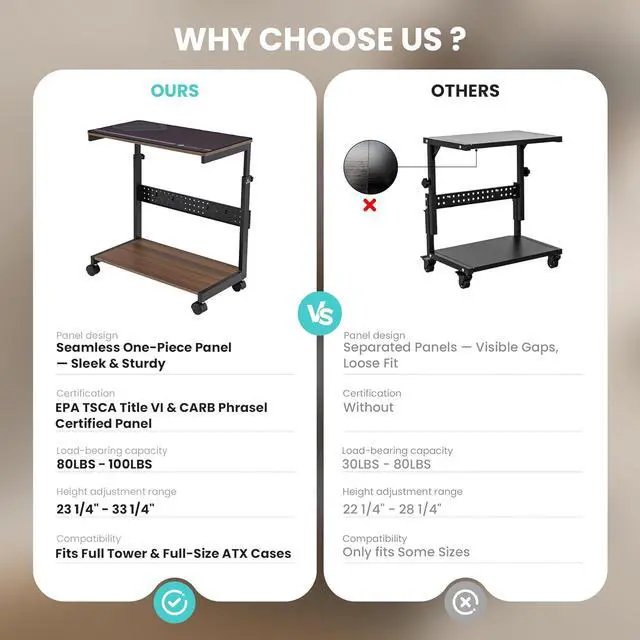 Sturdy Structure: EPA TSCA Title VI & CARB Phrase Certified desktop panel with premium anti-scratch finish. Thickened steel frame with powder-coated finish resists corruption to ensure stability and durability, not easy to scratch or deform, no wobbling. The bottom shelf max weight up to 100LBS, top shelf is 80 LBS.