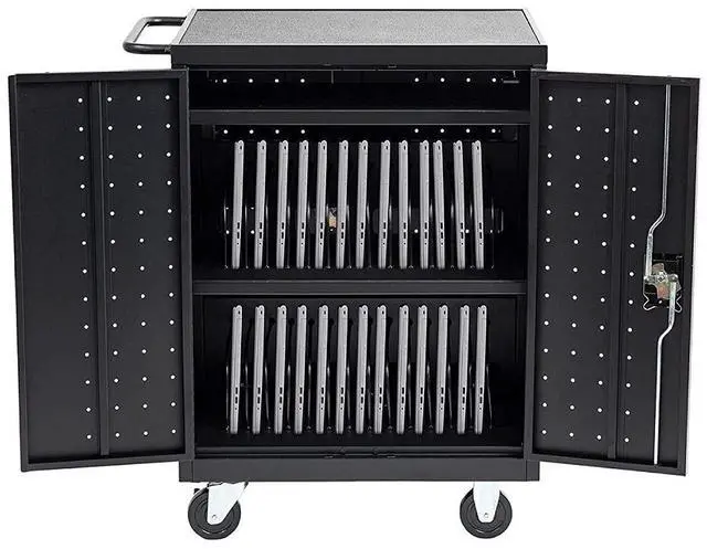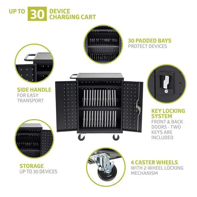 DEVICES: 30 padded bays, and an extra shelf allow you to store and charge 30 devices at one time, in a secure, space-saving, versatile, mobile cart