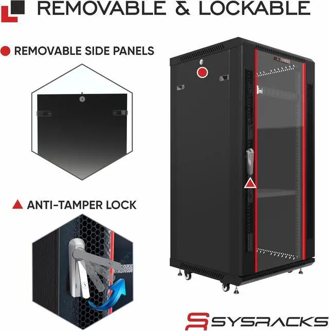 LOCKING GLASS DOOR & VENTILATION Tempered front door with perforation pattern and removable side panels provide secure access, visibility and enhanced airflow.