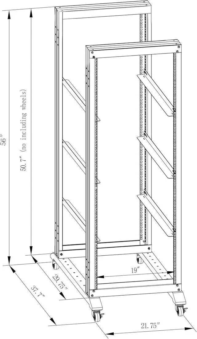 : GLOBALRACK 4-post open frame server rack, Network rack that complies with all 19-inch standard equipment. Installation depth 29.75 - 27.75 in, Equipped with brake wheelsCompatible with various servers, switches, data, AV, other IT equipment.
