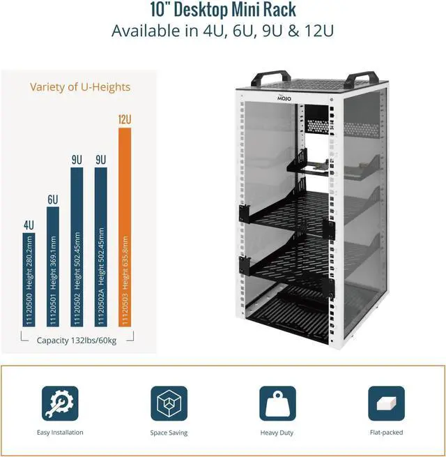 Height: This mini rack is designed for efficient equipment organization, featuring a space-saving 10-inch width and standard 12U height - ideal for desktops, home labs, small offices, or AV setups