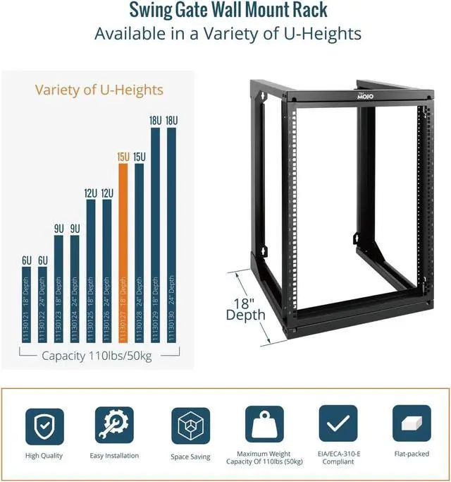 Specification: 15U Wall Mount Rack, 16inch apart Mounting holes; 18inch Depth; Square hole or tapped hole installation can be switched with each other