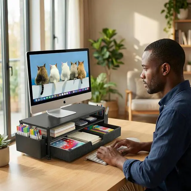Ergonomic Eye-Level Comfort Elevate your screen to the perfect eye level to eliminate neck strain and slouching. ECOLOVI desk organizer monitor stand promotes a healthier posture, reducing fatigue during long hours of work or studying, so you can stay focused and productive all day