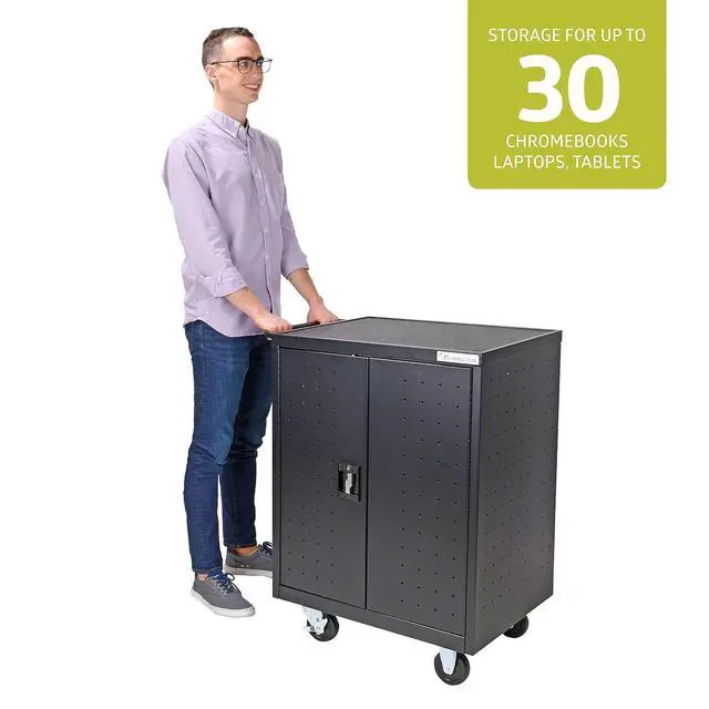 DEVICES: 30 padded bays, and an extra shelf allow you to store and charge 30 devices at one time, in a secure, space-saving, versatile, mobile cart