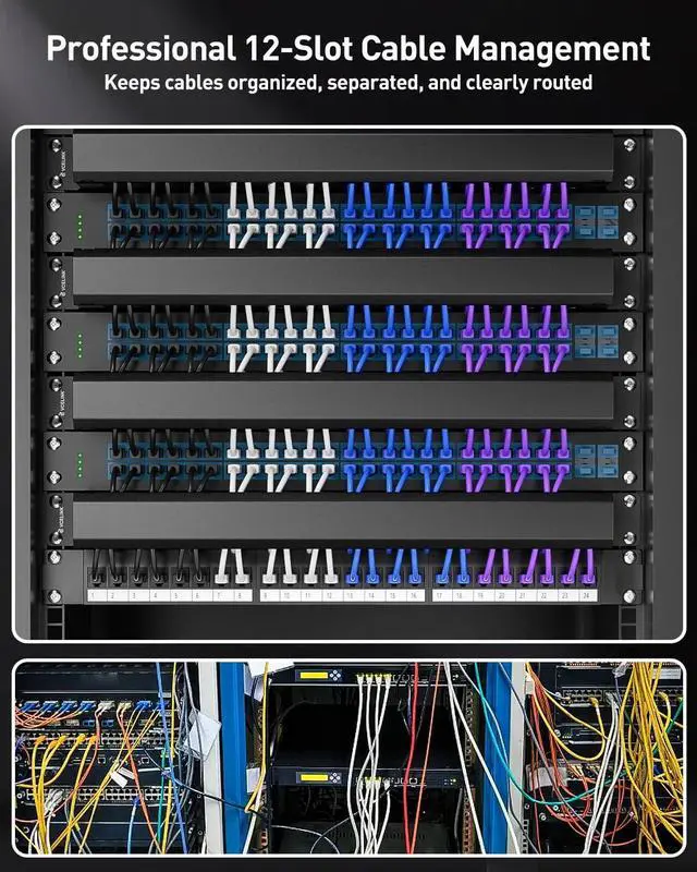 UNIVERSAL COMPATIBILITY: Fits all standard 19" racks, network cabinets, and wall-mount systems. Each of the 12 slots accommodates multiple RJ45, HDMI, RCA, Coax, Fiber Optics cables, and more your all-in-one solution for diverse cabling needs