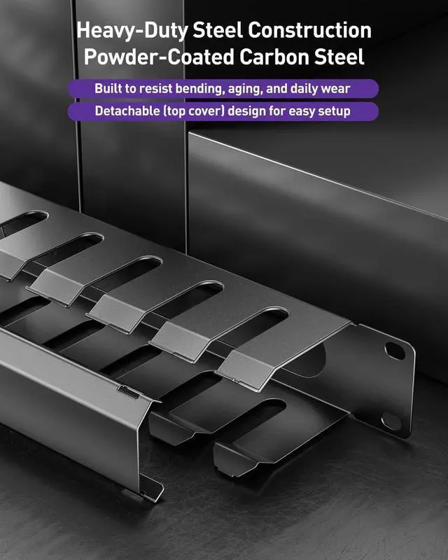 HEAVY-DUTY CONSTRUCTION: Constructed from carbon steel throughout with a powder-coated finish. This design resists bending, corrosion, and wear for reliable performance in high-demand network environments, outperforming plastic organizers that warp or crack under heat and pressure