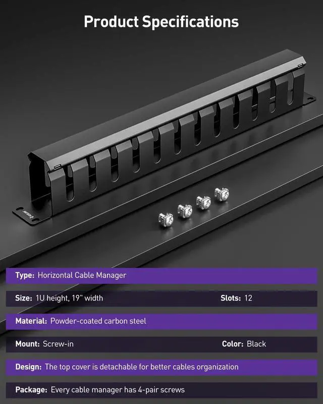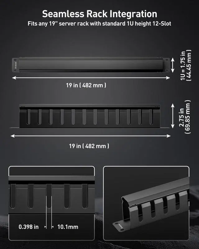 EFFICIENT CABLE ORGANIZATION: Maximize airflow and streamline maintenance with our 19-inch 1U rack cable management. Features 12 high-capacity slots to neatly separate and route bulk cables, boosting equipment stability and safety while reducing clutter