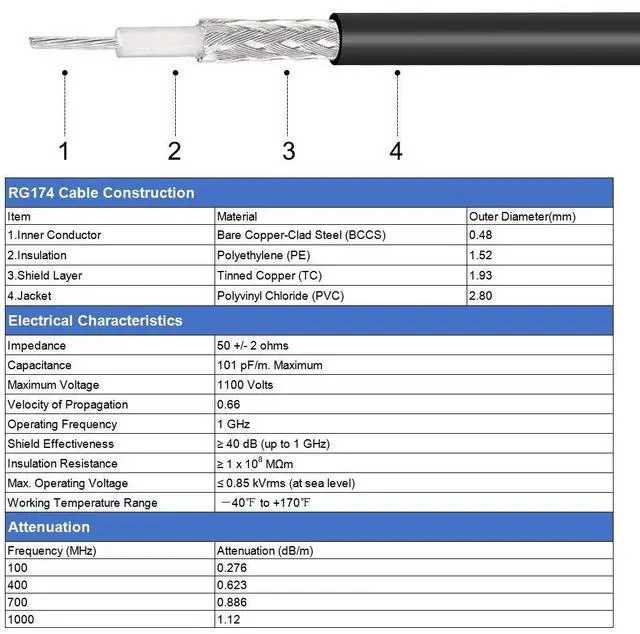 • RG174 coaxial cable has a durable and flexible PVC outer layer