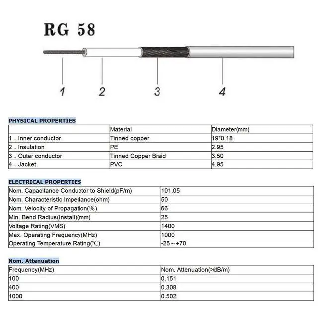 PL259 cable Impedance: 50 Ohm; Cable Type: RG58 coaxial cable; >1000 times mating life time.