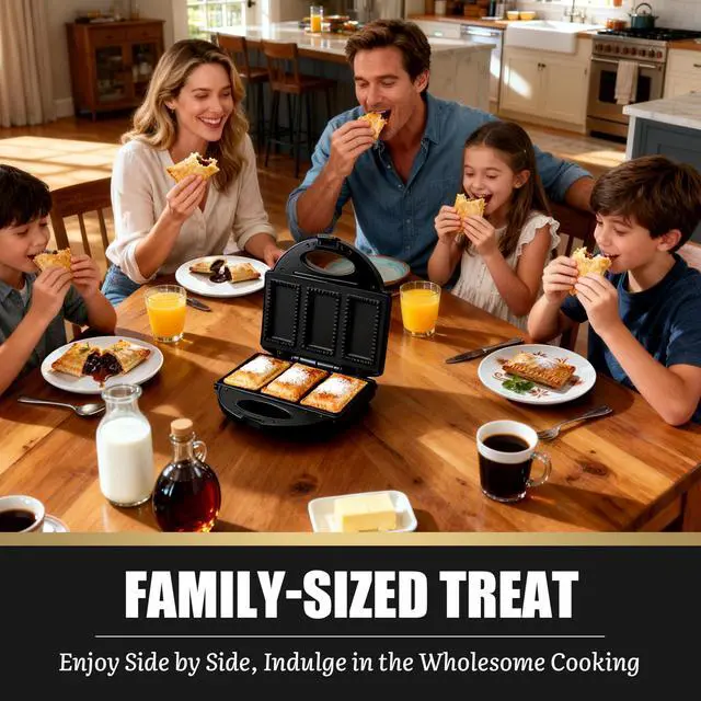 [MULTI POCKET PIES]: The iron heats up fast and evenly,I it cooks up to 3 pieces of 4.5x2.5 Pocket Pies in minutes. [POCKET PIE FUN]: Nice to serve your kids, families or friends with your lovely homemade pocket pies, grilled cheese or PB & J Sandwiches. Perfect choice for breakfast, brunches, parties and events. Be creative with your filling and toppings. [EASY TO USE]: Package Includes a Crust Cutter, so you can measure the perfect size of crust for you pocket pies every time. [EASY TO CLEAN & STORE]: The machine has a non stick surface, it is very easy to clean up after baking. The machine measures 9.2x9.2x3.8, is compact and easy to store. [PERFECT GIFT]: Excellent gift for birthday, holiday and more.