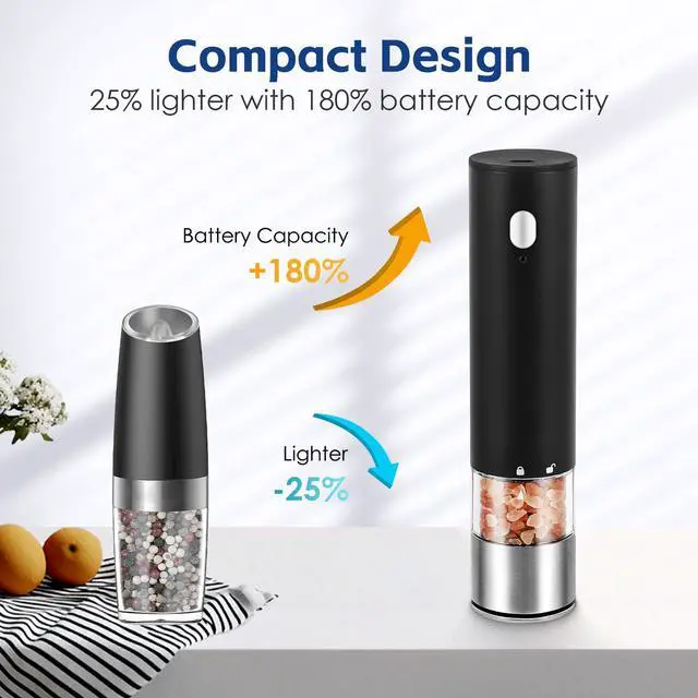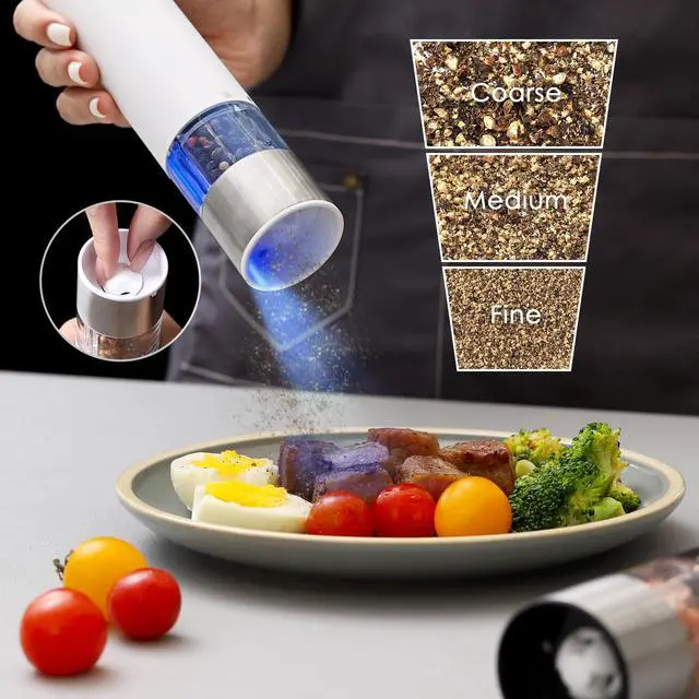 Effortlessly add a touch of freshly ground spice to your dishes with this electric pepper grinder. Featuring a rechargeable battery, you'll never have to worry about running out of power mid-grind. Simply give it a twist and let the powerful motor do the work, delivering a consistent grind every time. The transparent body allows you to see when it's time for a refill, while the sleek design complements any kitchen decor. Adjust the coarseness settings to your desired texture, from a fine powder for sauces to a coarse grind for steaks and salads. With its ergonomic grip and one-handed operation, this electric pepper grinder is a must-have for any home chef or seasoning enthusiast. Ditch the manual grinders and upgrade to the convenience of electric grinding. Dimensions: approximately 8 inches tall (20.3 cm). Requires 2 AA batteries (included).