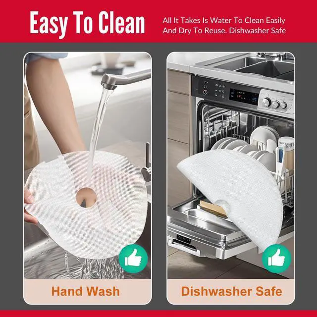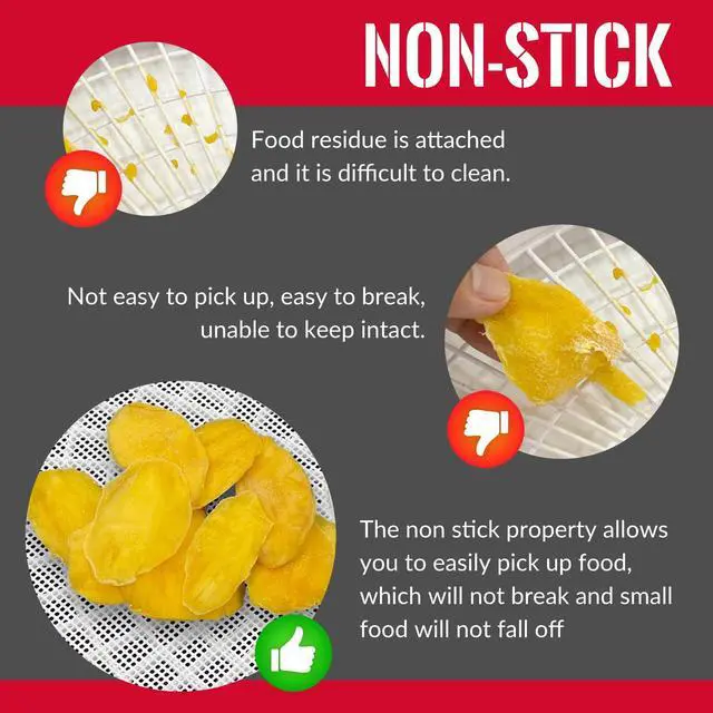 • Non-Stick & Easy to Clean: After drying your food, you can effortlessly gather and store itit wont stick to the mat at all, and it stays perfectly intact without crumbling. Whether you're drying sticky fruits or savory jerky, cleanup is a breezesimply rinse with warm soapy water or wipe clean for reuse.
