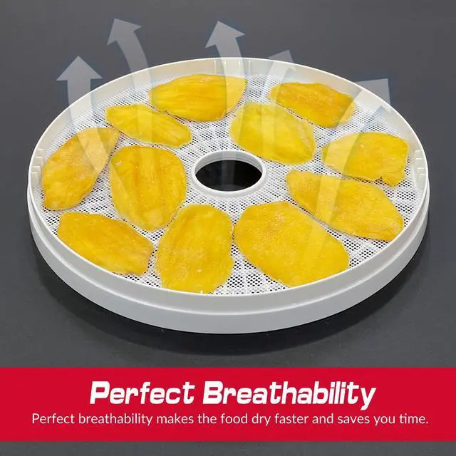 • Optimal Airflow & Fine Mesh Design: The 1x1mm mesh holes promote fast, even drying with top and bottom airflow, saving you time and energy. The fine mesh design prevents small fruits like blueberries and raspberries from falling through, while allowing liquids to drain easily. Perfect for dehydrating fruits, vegetables, herbs, jerky, and more (Not to be used for Fruit leather)