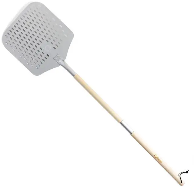 Get the peel designed to launch and scoop your pizza in and out of the oven. With perforations, excess flour and cornmeal drops prior to launch, while the holes also help prevent raw dough from sticking.