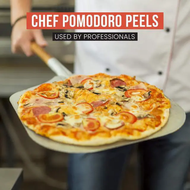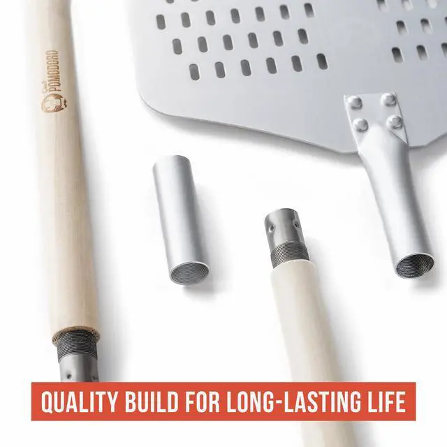 Effortlessly transport even large pizzas to and from your commercial grade oven with the Chef Pomodoro Perforated Pizza Peel. Expertly crafted for use by professional chefs to achieve perfect, artisan pizzas each time. Anodized food-grade aluminum resists rust and stands up to frequent use and high-heat. But the perfectly placed perforations are the start of the show! They reduce friction, making it impossibly easy to glide your pizza in and out of the oven. Plus, they force excess cornmeal and flour off the bottom of your uncooked dough, to help prevent burnt crusts.