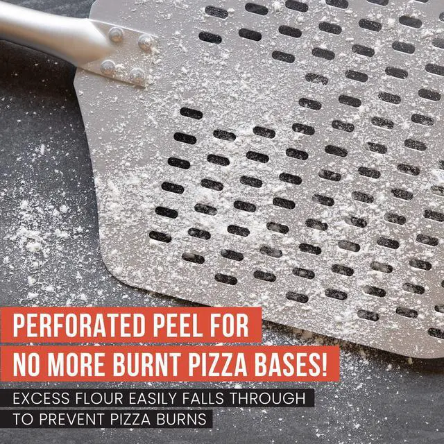 The 1-2 punch of a peel designed to launch raw pizzas while also scooping cooked pizzas. The perforated peel is the all-in-one solution that helps prevent raw pizza from sticking, while also being thin enough to scoop cooked pizzas with ease. It's incredible strength prevents warping and subdues heat from transferring pizza and baked goods to and from an oven/grill.