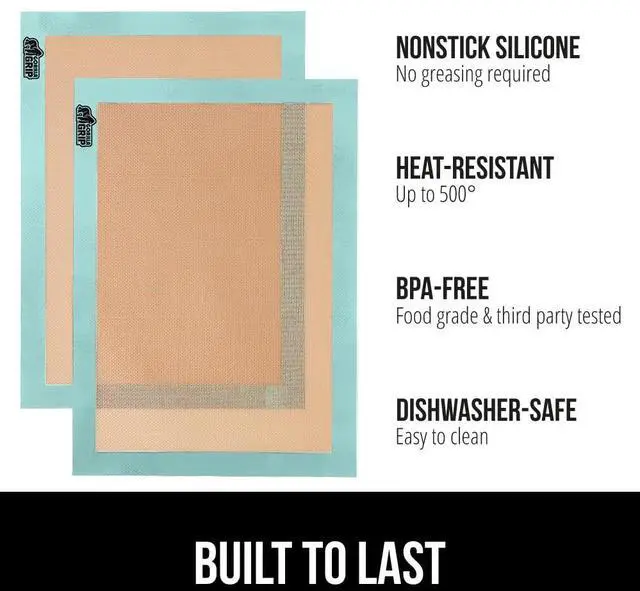Made from ultra-durable, thick silicone, these silicone baking mats are oven safe up to 500°F, with a slip-resistant design that prevents movement during use. Perfect for even baking without burning the underside. Safe for metal utensils (no serrated edges).