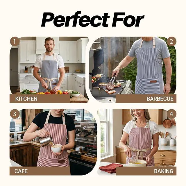 Skin-Friendly Durability | Stain-Resistant Fabric Crafted with 65% cotton + 35% polyester blend,our aprons balance softness against skin and oil/water resistance. Unlike plasticky competitors, the breathable weave wicks sweat duringhot kitchen tasks while blocking stubborn stains like wine or grease.Machine-wash cold maintains color vibrancy for 100+ washes.