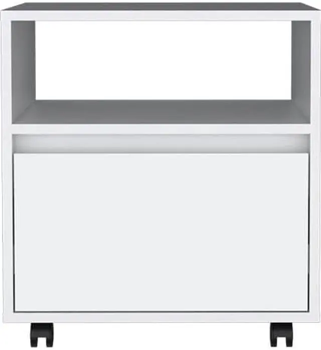 The Munyoch Nightstand features casters, making it easy to move around your room. It also has a drawer (15, 5""W X 13, 2""D), perfect for keeping your belongings tidy and out of sight. The open cabinet is excellent for storing books, controls, or your favorite decoration (17, 7""W X 15, 7""D). And the top surface is comprehensive and perfect for your needs. Order your Munyoch Nightstand today!