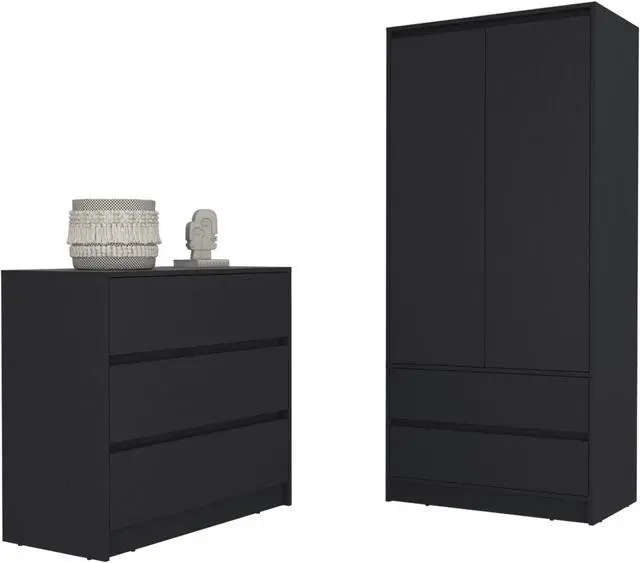 "This Lewes 2 Piece Bedroom Set is perfect for anyone looking for a modern, minimalist design with plenty of extra storage. The black manufactured wood finish on both pieces of furniture will match any decor, and the large armoire is perfect for storing clothes, linens, or anything else you need out of sight. The dresser is also a great place to store your clothes, and its stylish design will add a touch of elegance to any bedroom.