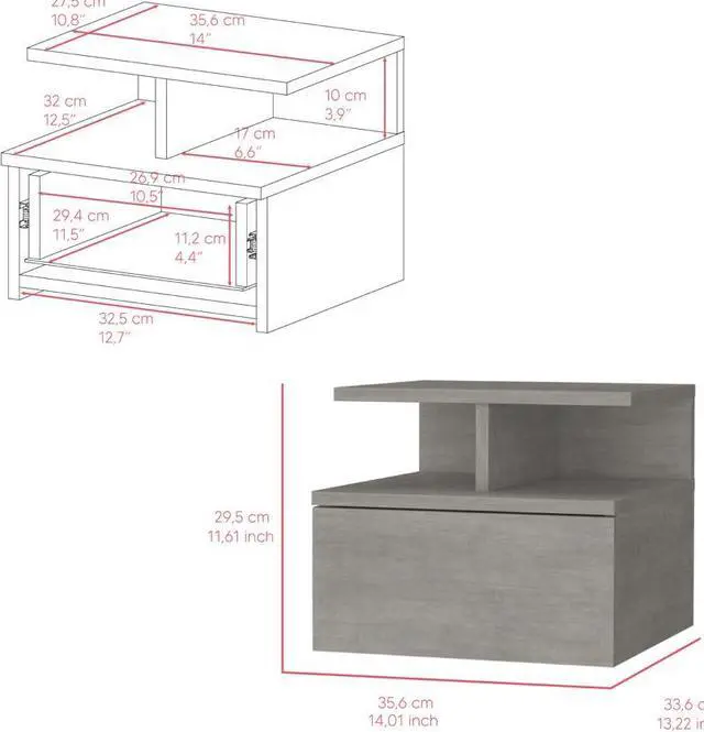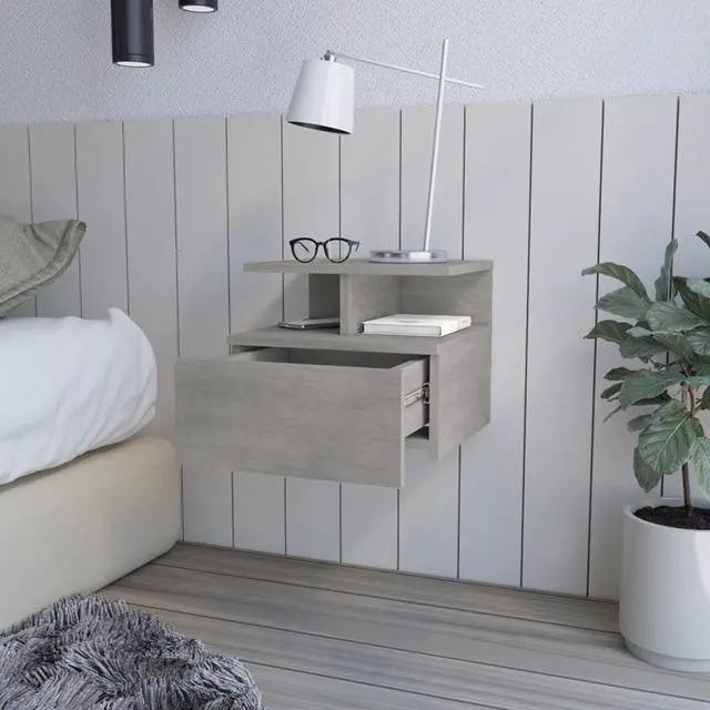 "The Flopini floating nightstand was designed in a modern way, designed to give style to your bedroom. With one drawer, size ( 4.4"" H x 10.5"" W x 11.5"" D), and one shelf (14"" W x 10.8"" D), you can organize your books favs and accessories. Designed with an elegant white manufactured wood finish.
