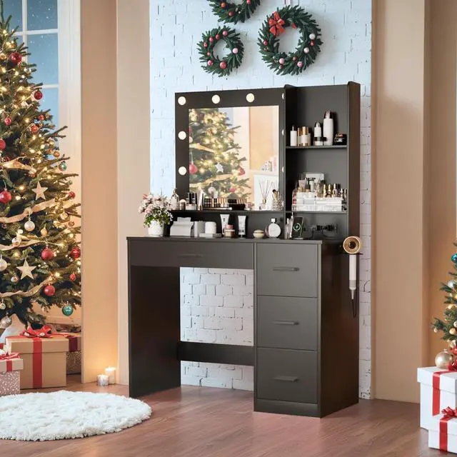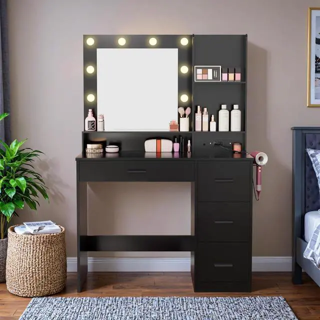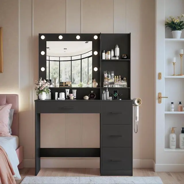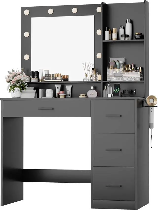 The desk vanity table is equipped with 2 AC outlets, 2 USB ports and a hair dryer rack. You can conveniently blow dry your hair in front of the mirror while charging your mobile phone, tablet or other mobile devices to make your life more convenient