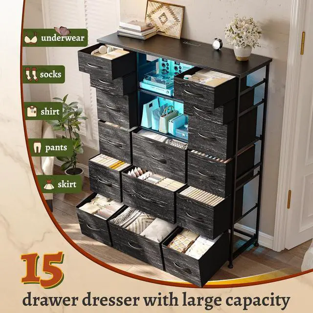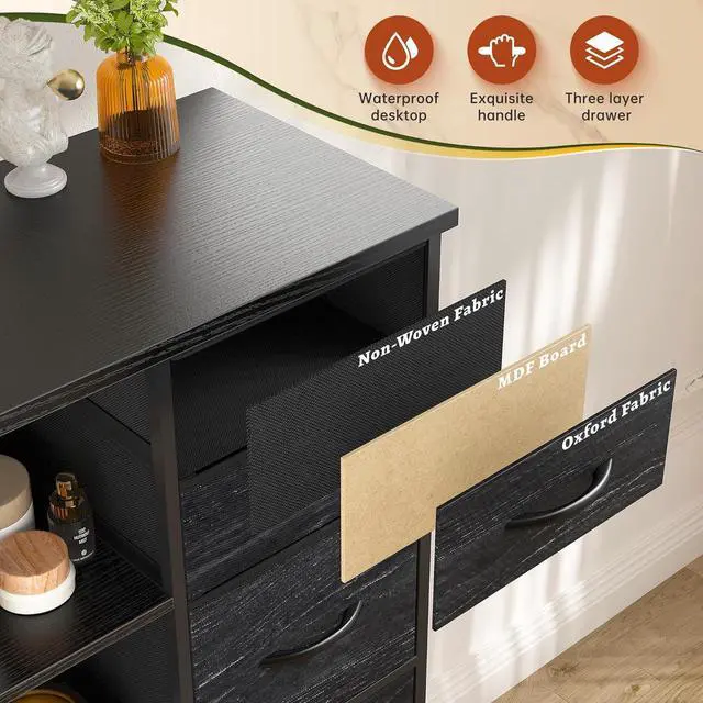 Modern Dresser with Hutch StorageThis new design dresser for storage offers extra two wooden hutchs for temporary items and decorations, which meeting your diverse storage needs. This Dressers & Chests of Drawers is suitable for storing books, aromatherapy products, skincare items, or collectibles, records, wine glasses, etc. It provides you with additional display and decoration space alongside clothing storage, making it the best choice for organization enthusiasts. Suitable for various spaces such as bedrooms, living rooms, closets, entryways, apartments, dormitories, offices, etc
