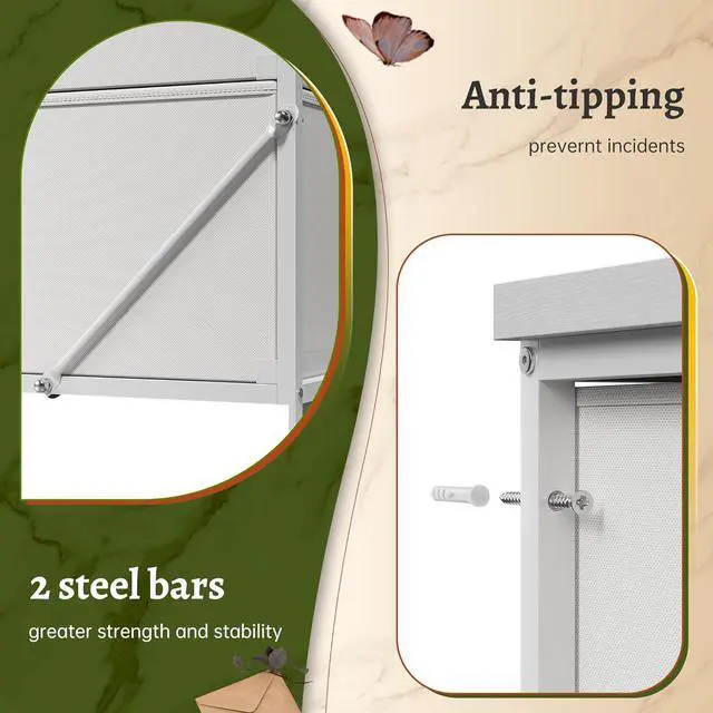 Durable ConstructionThe sturdy steel frame provides stable support and ensures years of use; The anti-tipping accessories prevent the wardrobe from tipping over. The 4 adjustable feet can protect your floor from scratches. The quality fabric drawers are breathable and applied