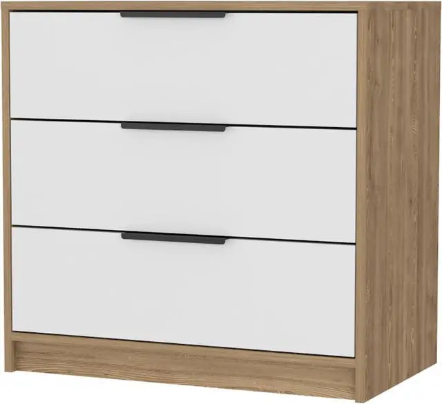 Beautiful rustic-contemporary Washington white chest of drawers suitable for any interior decoration in the bedroom, bathroom, kitchen, or living room. Its design gives a minimalist touch, especially for people who want to give light to their spaces. It has a delicate surface to superimpose decoration elements, consoles, and everything you need for daily living. This dresser is designed for you, beautiful, optimal size, and thanks to its three large drawers, you can store clothes, bedding, or general storage.