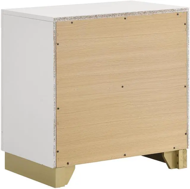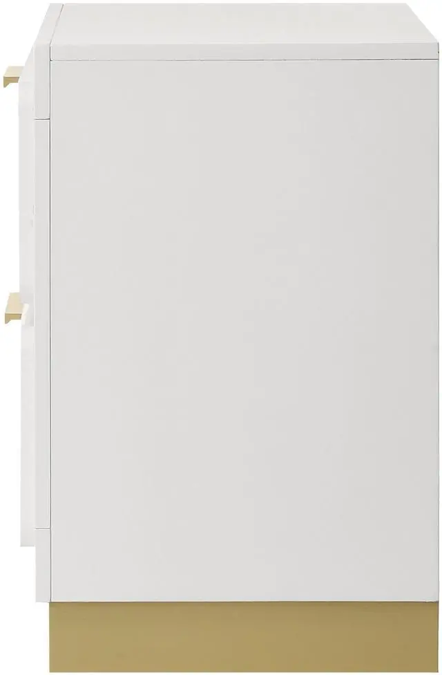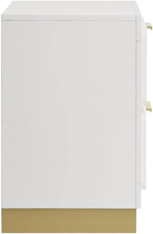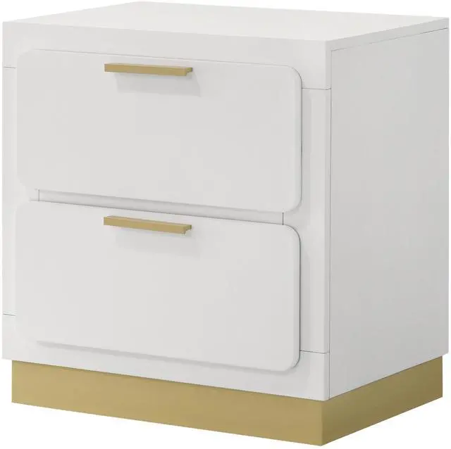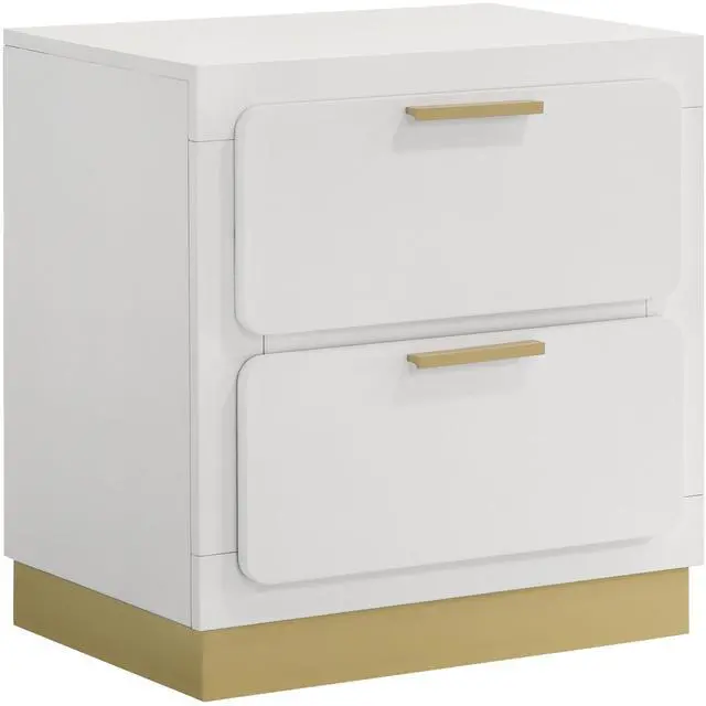 This contemporary nightstand blends sleek form and practical function, featuring two drawers for convenient bedside storage with a bold black base and metallic gold accents for a striking contrast. The stylish bar drawer pulls, recessed base, and smooth metal glides offer both sophistication and ease of use, making it the perfect addition to modern bedrooms.