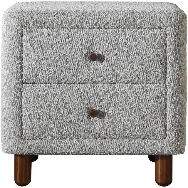 This nightstand gets a chic update in textured boucle fabrication, adding a whimsical touch to any bedroom with its softly curved frame that softens the overall look while injecting a dash of trendy allure. Blending mid-century minimalism with plush boucle upholstery and wooden legs for a unique mix of styles, the nightstand offers two drawers for convenient storage of bedtime essentials.