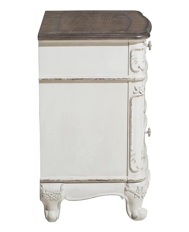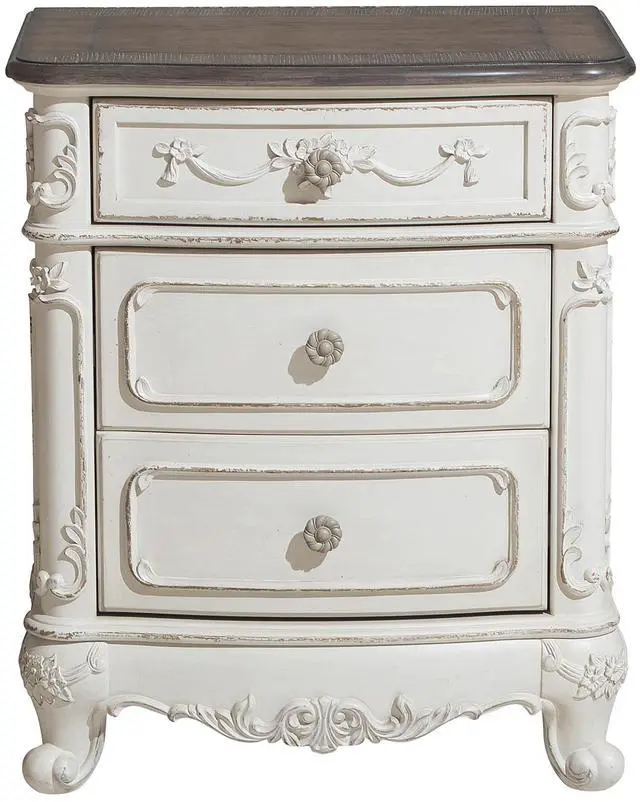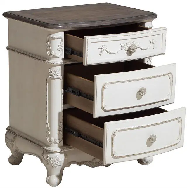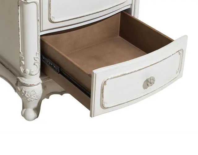 The Cinderella Collection is your little childs dream come true. The Victorian styling incorporates floral motif hardware and traditional carving details on the white with gray rub-through finished nightstand that will create the feeling of stepping into a fairy tale.