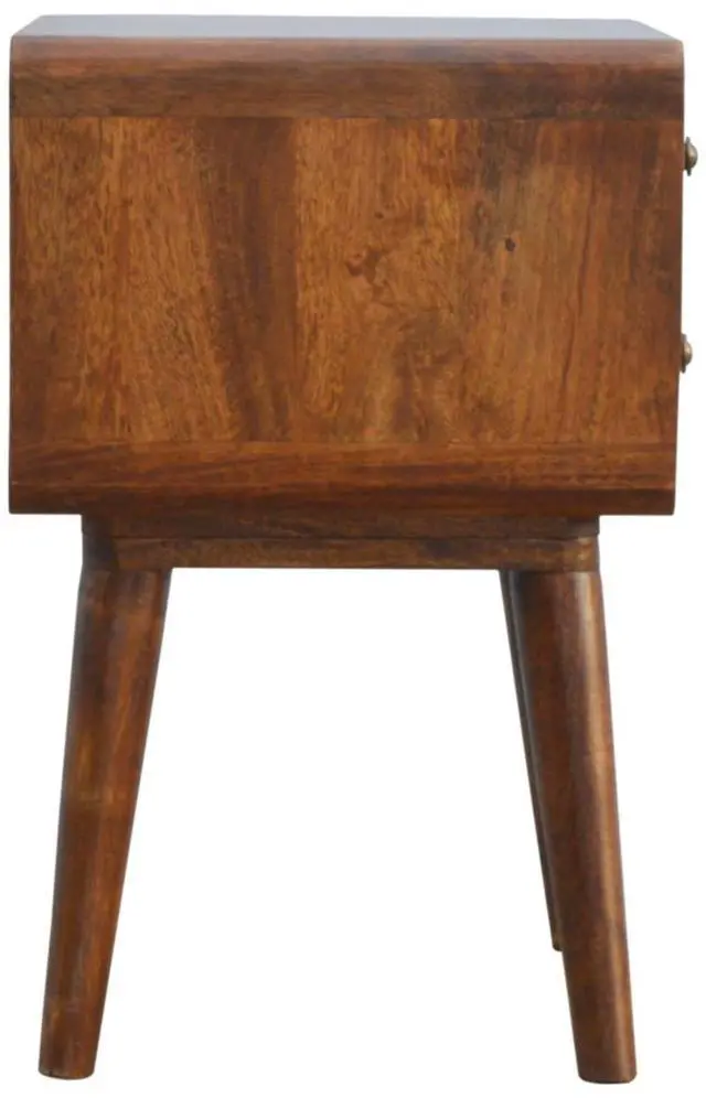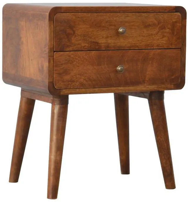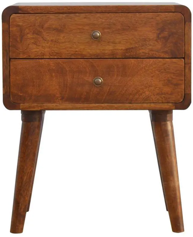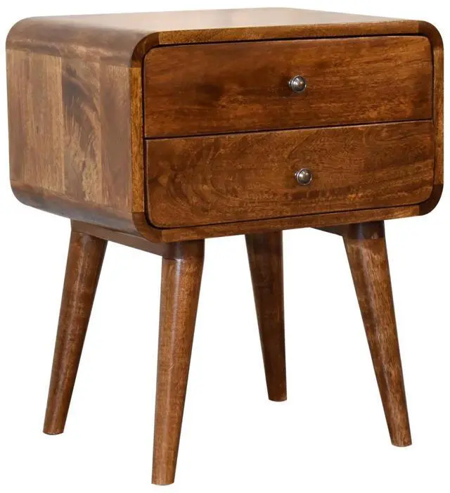Endlessly versatile, this curved nightstand table makes a perfect stand for nibbles, drinks, or a lamp. It will prove handy all over your home and is made from 100% solid mango wood and has a fine chestnut finish. It has curved edges which will fit into any home/living space. It also comes with 2 drawers that come with shiny knobs and 4 Nordic style legs.