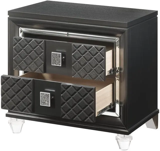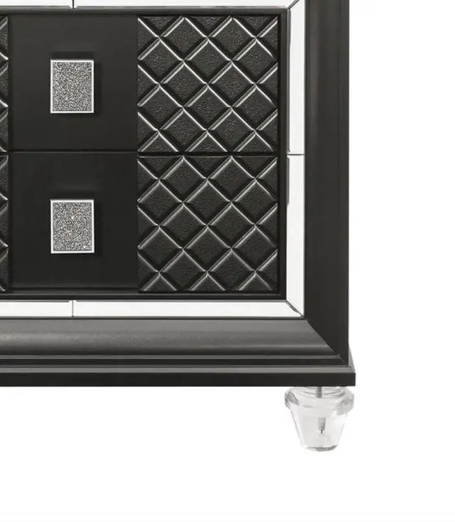 This glamorous nightstand features two spacious drawers, each adorned with sparkling trim and embossed fronts for a touch of luxury and intricate design.