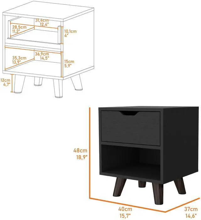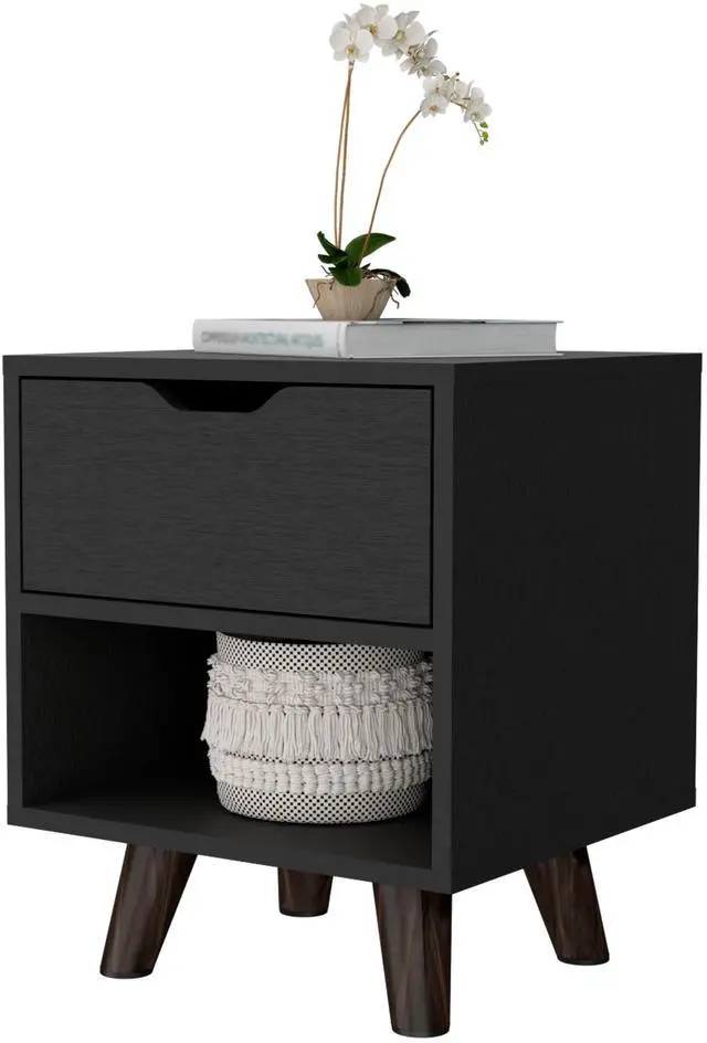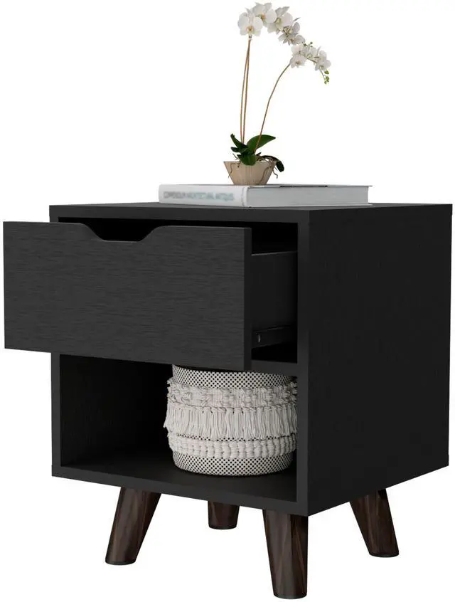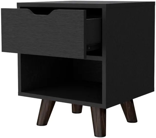 This stylish piece features a convenient 1-drawer design for essentials and a spacious open storage shelf, all elevated by stylish wooden legs, bringing modern design into any space. Compact and versatile, this nightstand fits seamlessly into any desired location, offering organization and style at your fingertips.