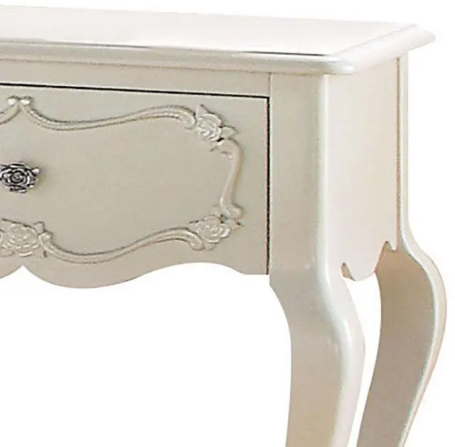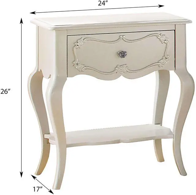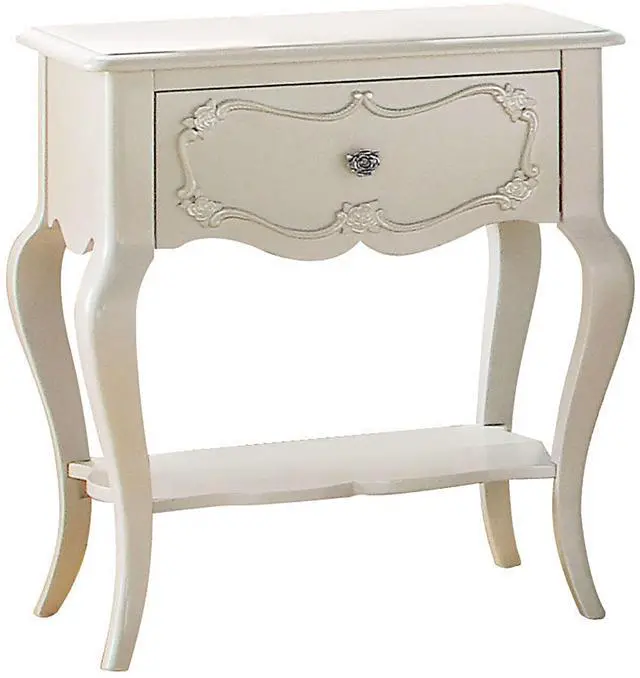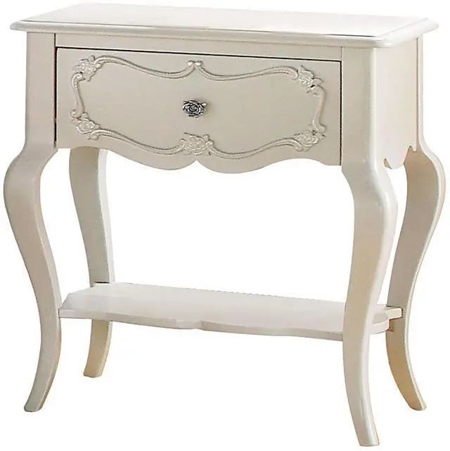 The drawer of this piece offers enclosed storage for personal items, complemented by an open compartment perfect for displaying decor or storing frequently used essentials. Its scalloped apron and shelf enhance the piece with elegance and structural integrity, showcasing intricate craftsmanship that elevates its aesthetic appeal.