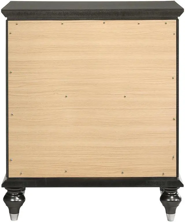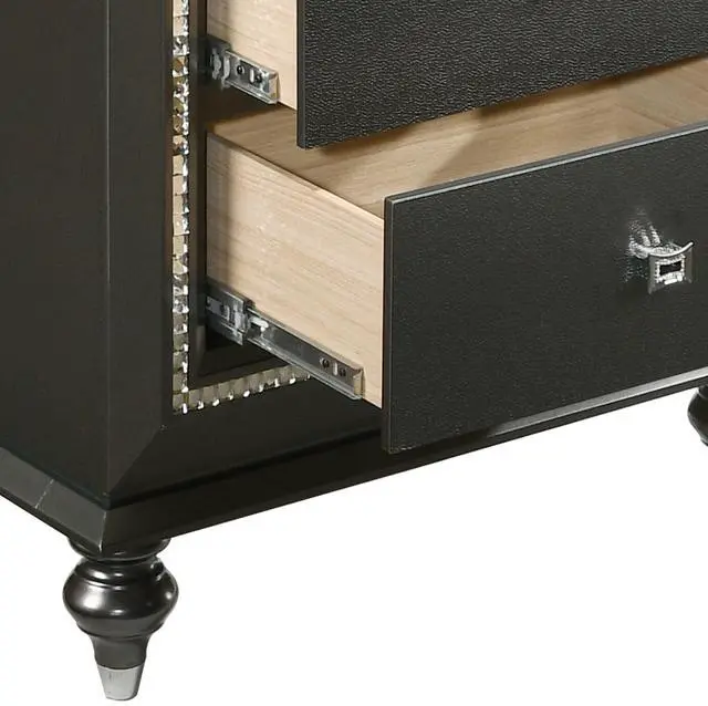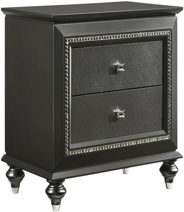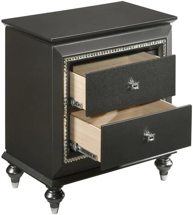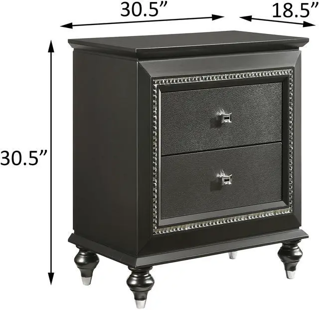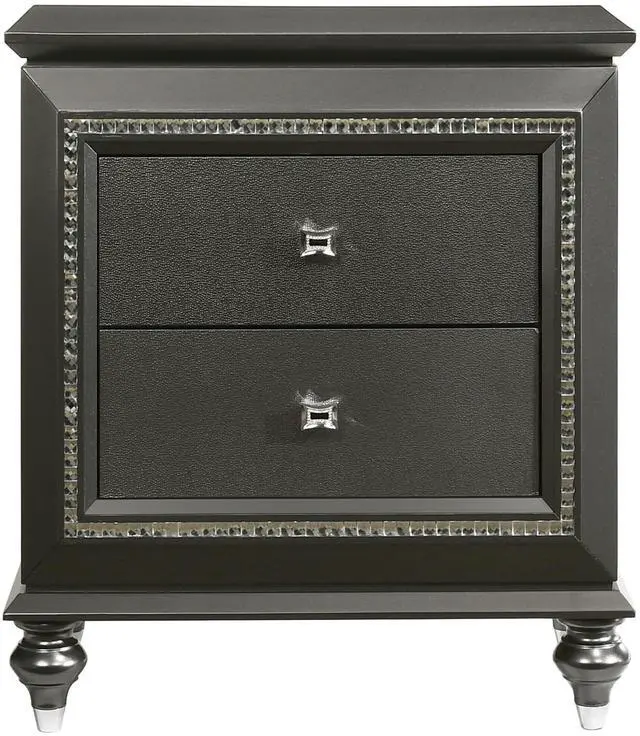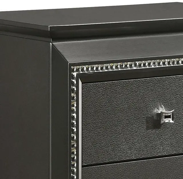 This sleek nightstand boasts a metallic grey finish, infusing your bedroom with contemporary style, while its two spacious drawers ensure ample storage space for your belongings, keeping them organized and accessible. Equipped with safety stops, the drawers offer added functionality and safety, while the transitional design is elevated by sparkling crystal-like trim, adding a touch of sophistication and glamour to your space.