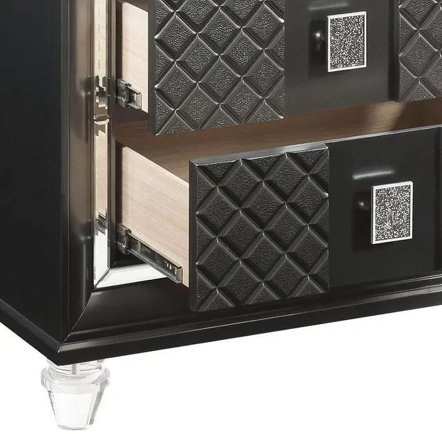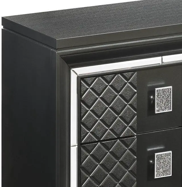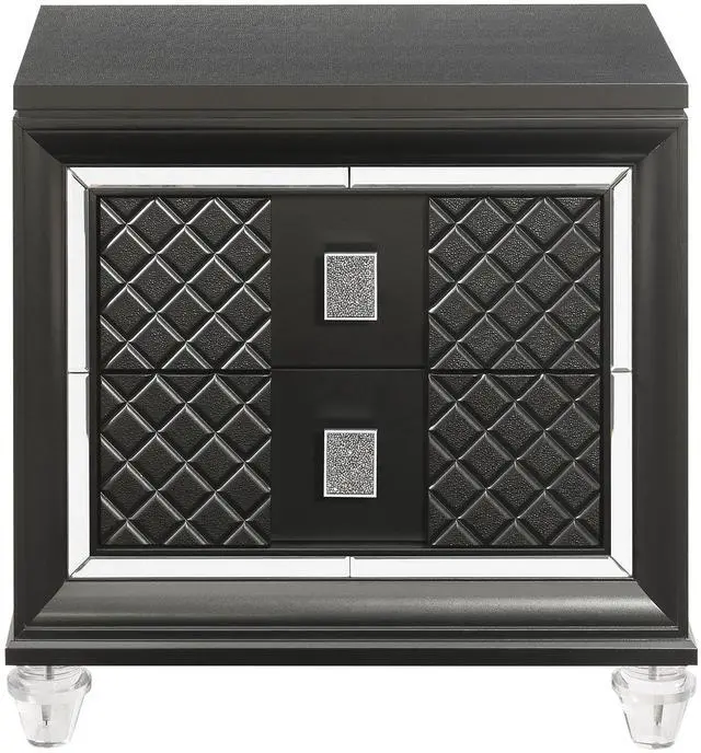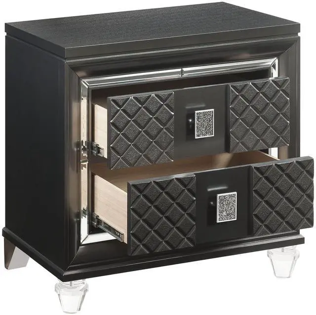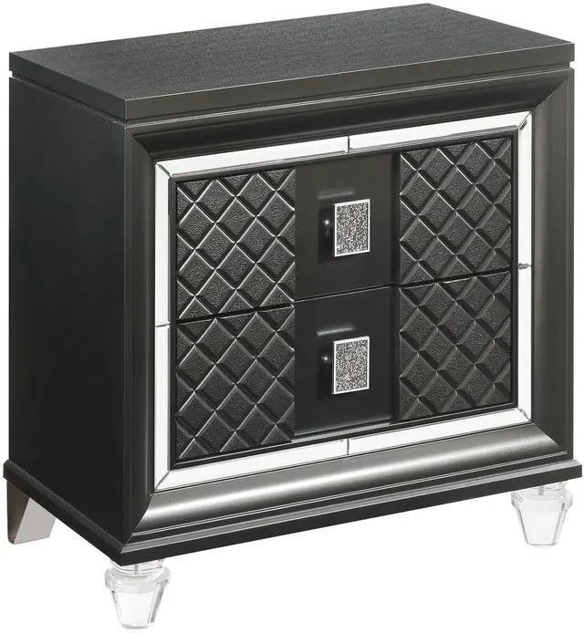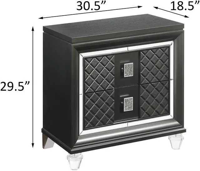 This modern nightstand boasts two drawers, offering ample storage for bedside essentials, while its metallic grey finish adds a sleek and sophisticated touch, elevating its contemporary appeal. The felt-lined top drawer provides a luxurious and protective surface for delicate items, complemented by safety stops in the drawers for smooth and secure operation, and clear acrylic tapered legs that add a touch of modern elegance, creating a visually striking contrast against the metallic grey finish.