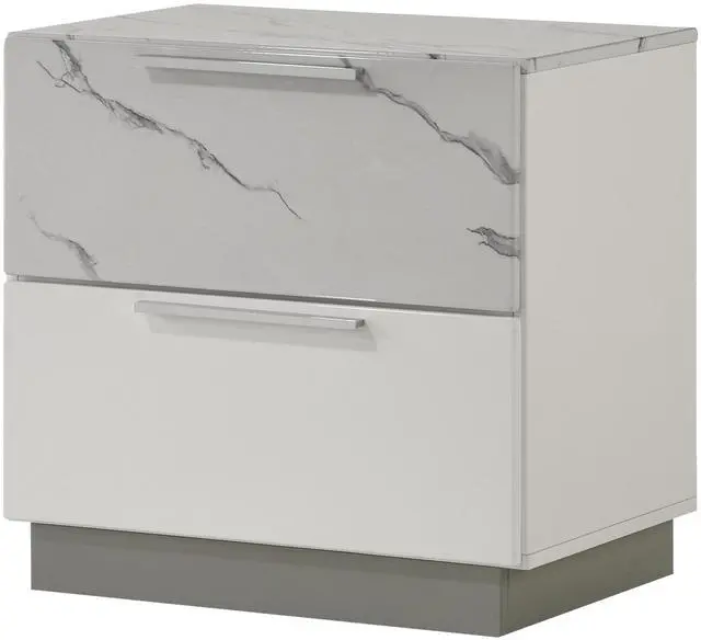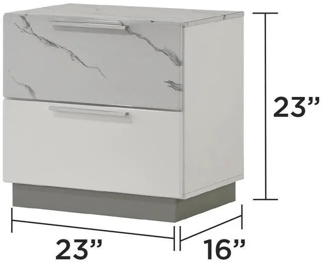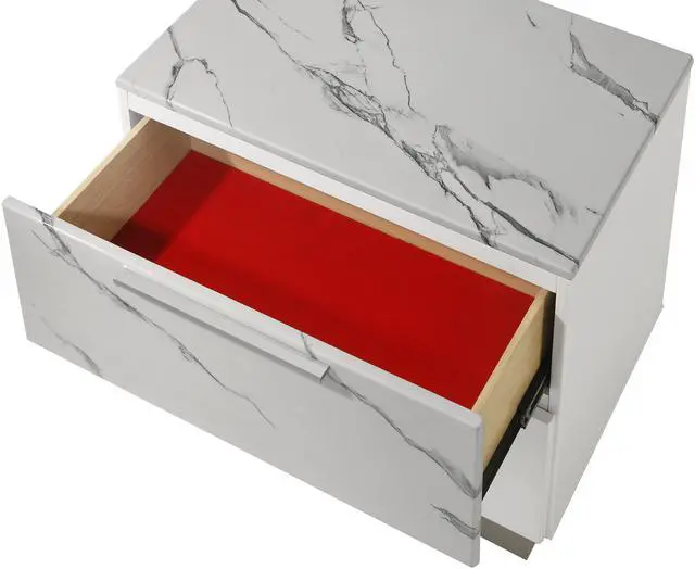 Elevate your bedroom's convenience and style with this chic modern nightstand. The piece features a sleek white lacquer finish complemented by marble-like accents that exude sophistication and luxury. With two smooth-operating drawers, this nightstand offers ample storage for your bedtime essentials. The top drawer is lined with red velvet, providing a plush compartment that's perfect for storing delicate items like jewelry or electronic devices. The compact design ensures it fits neatly beside your bed, making it both a functional storage solution and a stylish addition to your bedroom decor.