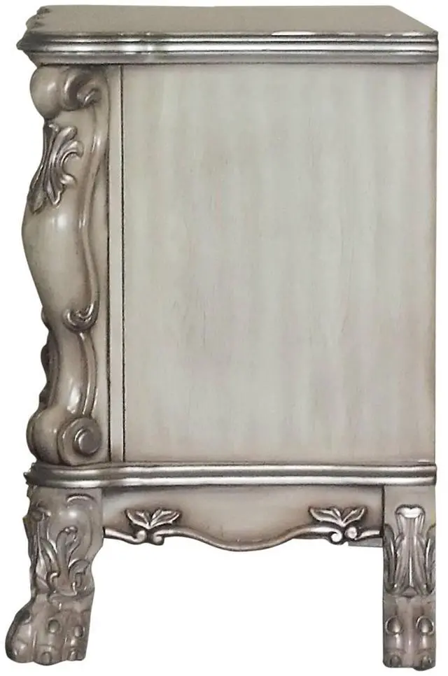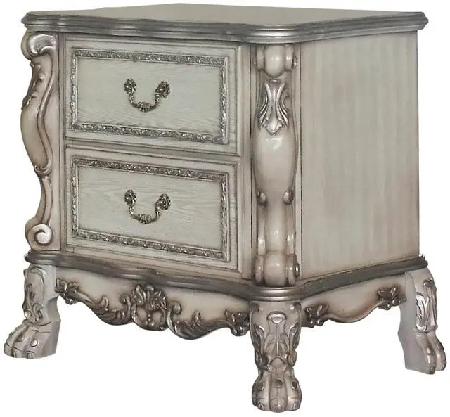 This nightstand features an elegant and playful design, adding charm to your bedroom decor with two felt-lined drawers for safe, soft storage of your precious items. Classic ornamental elements and wooden claw legs enhance its traditional charm and sophistication while providing stability and style.