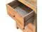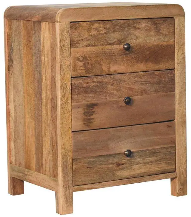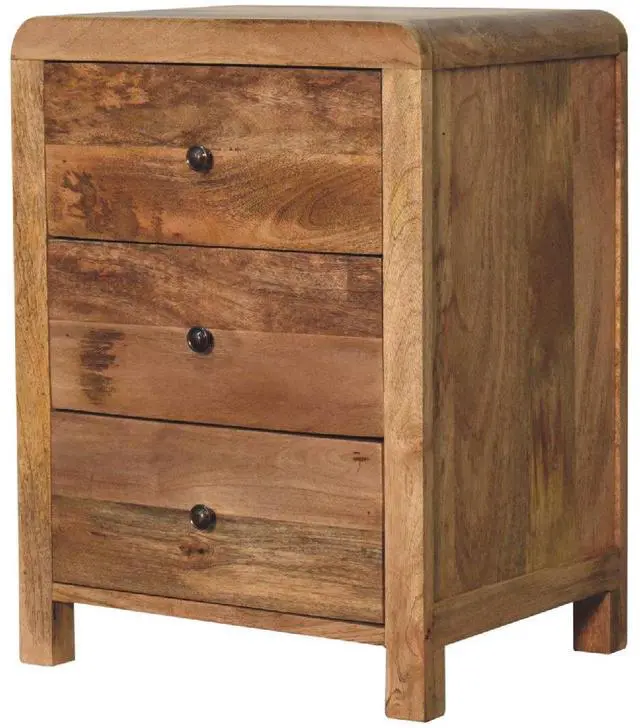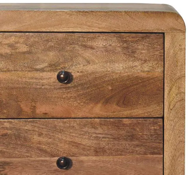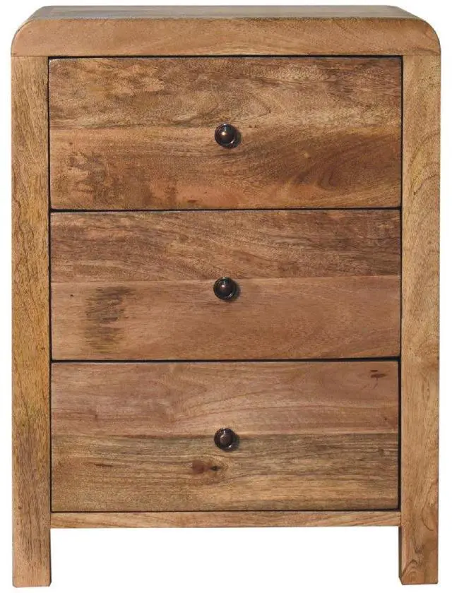 Featuring rounded corner edges, this naya bedside is a staple in the bedroom with 3 large spacious drawers perfect for keeping things close before bedtime, it is constructed from 100% solid mango wood in a oak-ish finish and has shiny brass knobs for easy access into and from the drawers.
