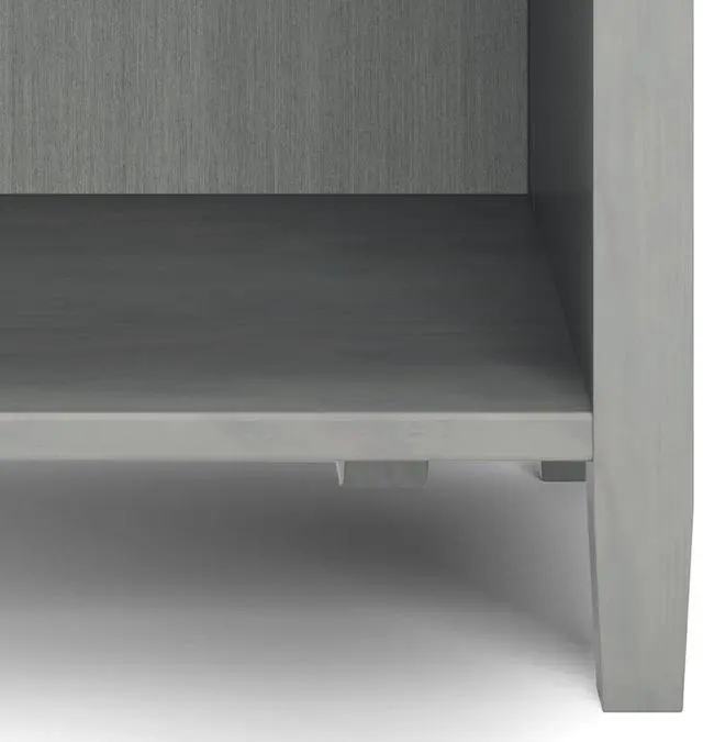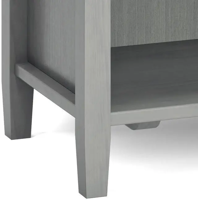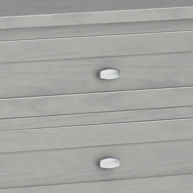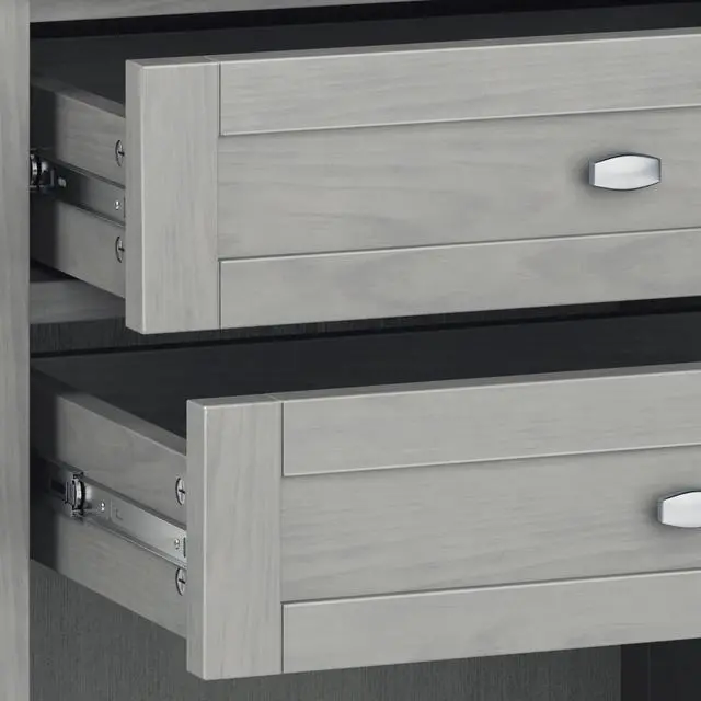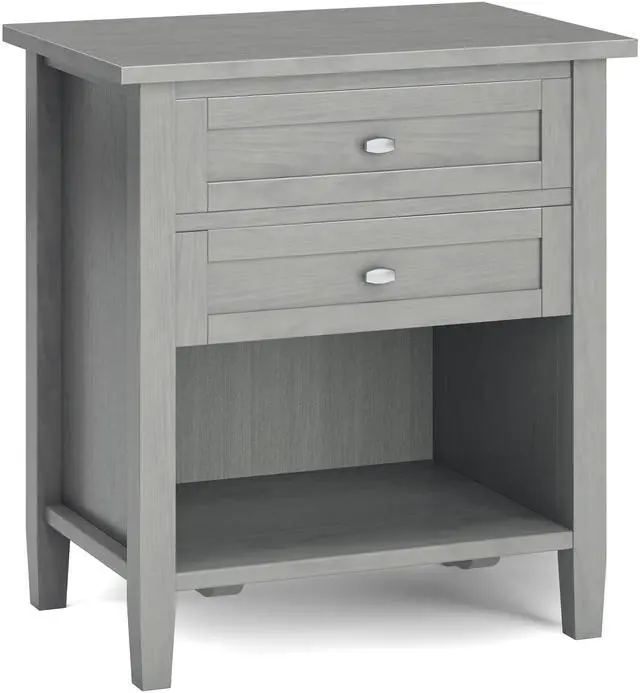 Features two (2) spacious drawers, open bottom storage area, brushed nickel drawer pulls and metal drawer glides