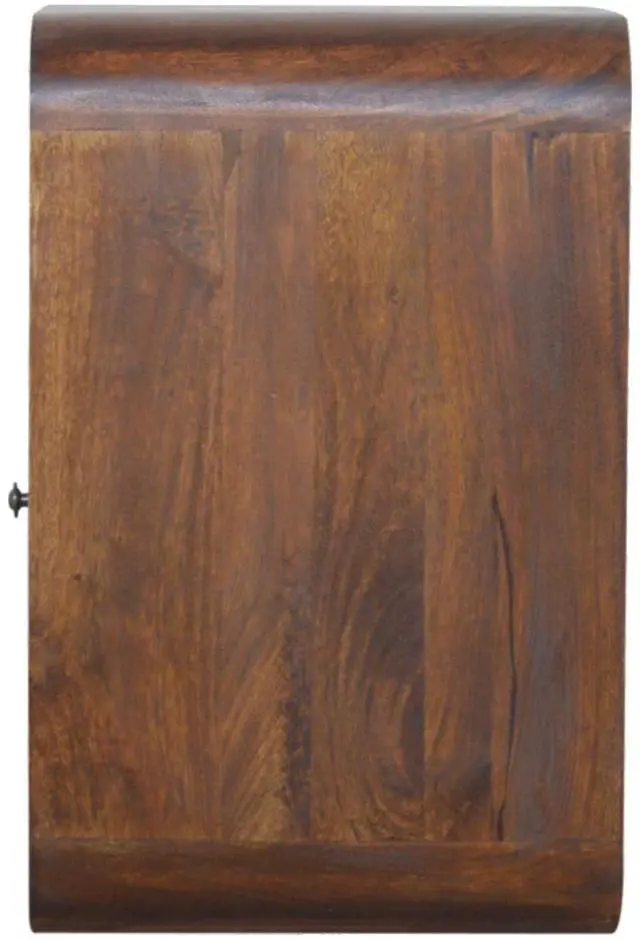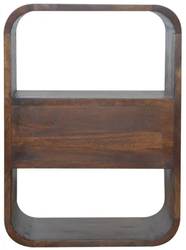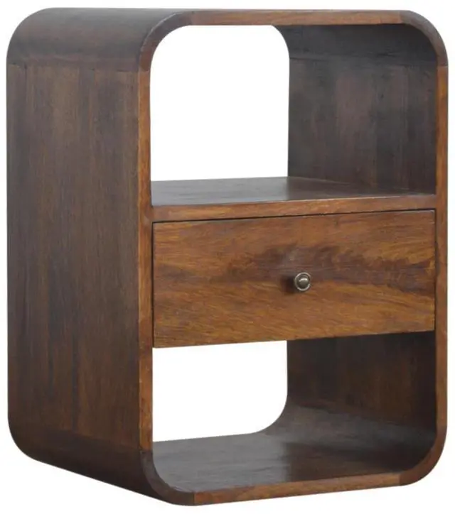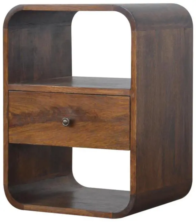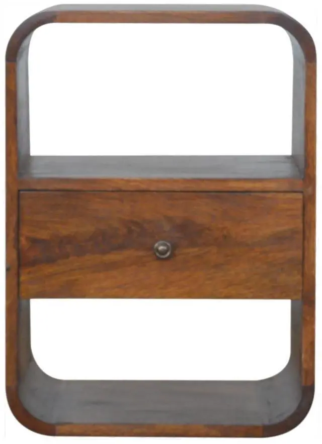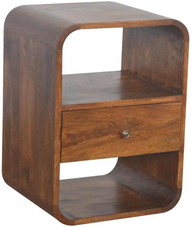 This solid wood bedside has been constructed from 100% solid mango wood in an chestnut finish and offers a nice rounded look on the edges. It features 1 drawer which comes with a shiny knob and 2 open slots for extra storage. A great simple and addition to the bedroom.