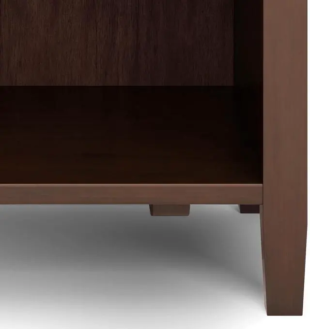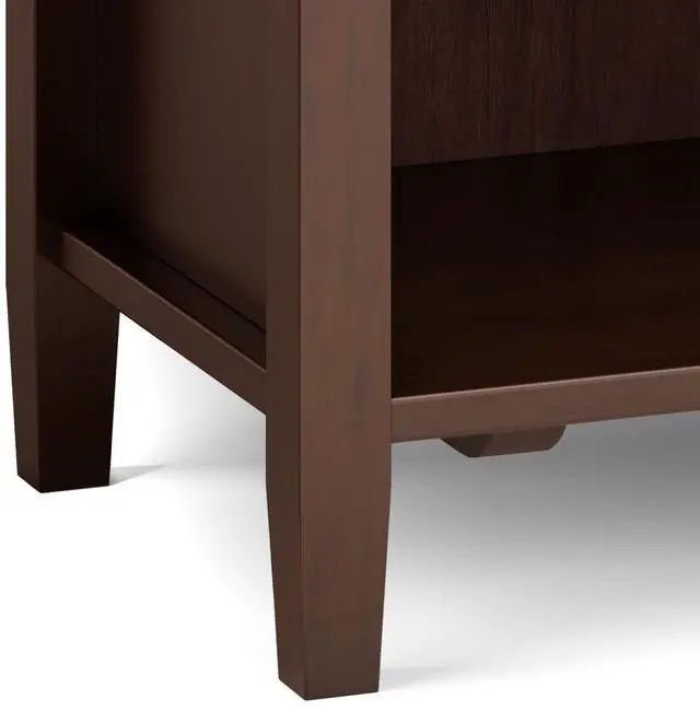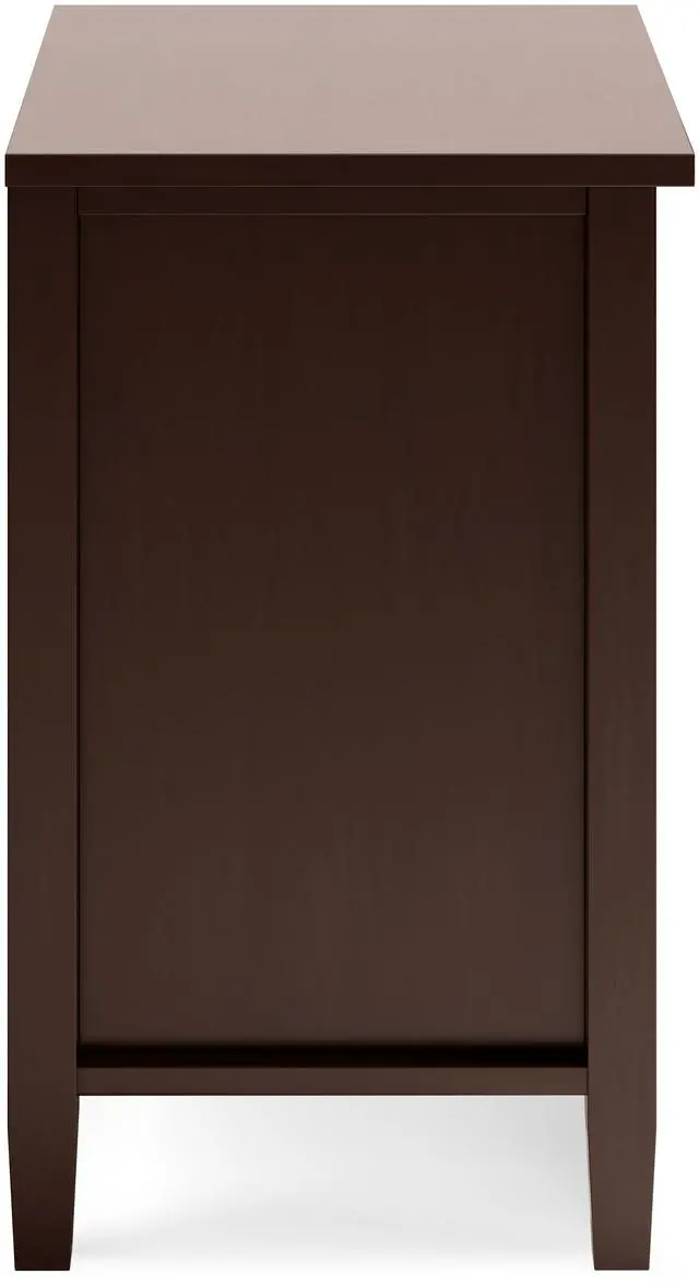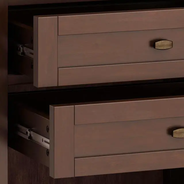 Features two (2) spacious drawers, open bottom storage area, brushed nickel drawer pulls and metal drawer glides