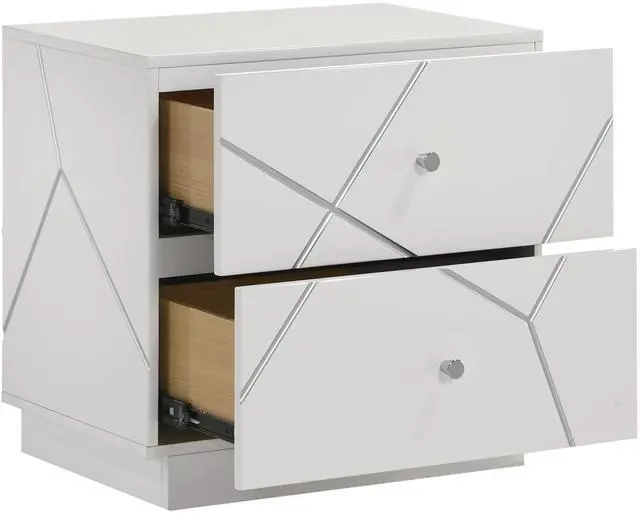 This elegant nightstand is a perfect addition to any modern bedroom, offering both style and functionality. Finished in a lacquer finish, it enhances the space with its bright, clean look. The nightstand features two spacious drawers, each lined with luxurious red velvet, ideal for storing your bedside essentials while protecting delicate items. The geometric design on the drawer fronts adds a contemporary edge, complementing the minimalist aesthetics of modern decor. Smooth metal runners ensure the drawers operate effortlessly, providing easy access without sacrificing style. Compact yet practical, this nightstand fits easily beside your bed, making it a convenient and stylish storage solution.