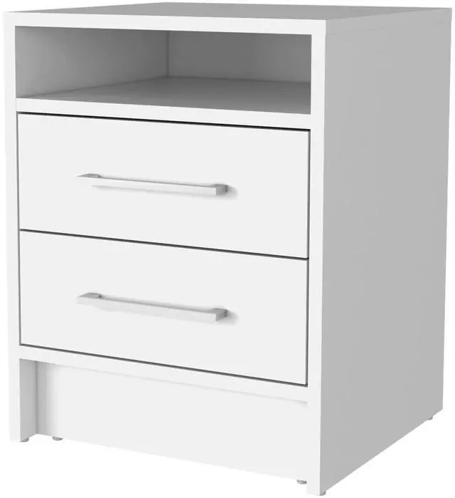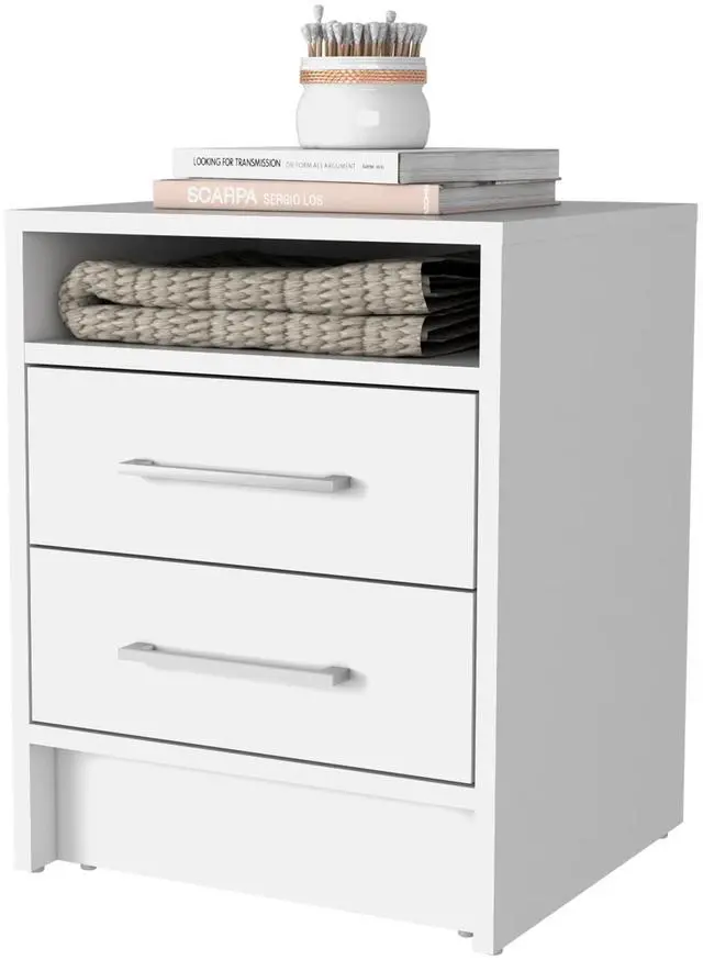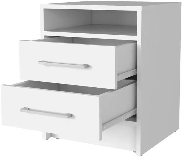 Transform your bedroom with this stylish nightstand, featuring two spacious drawers on high-quality rails for smooth operation and an open shelf for additional storage. Crafted from durable melamine and particle board, it offers a practical and elegant solution for all your storage needs, making it perfect for any decor.