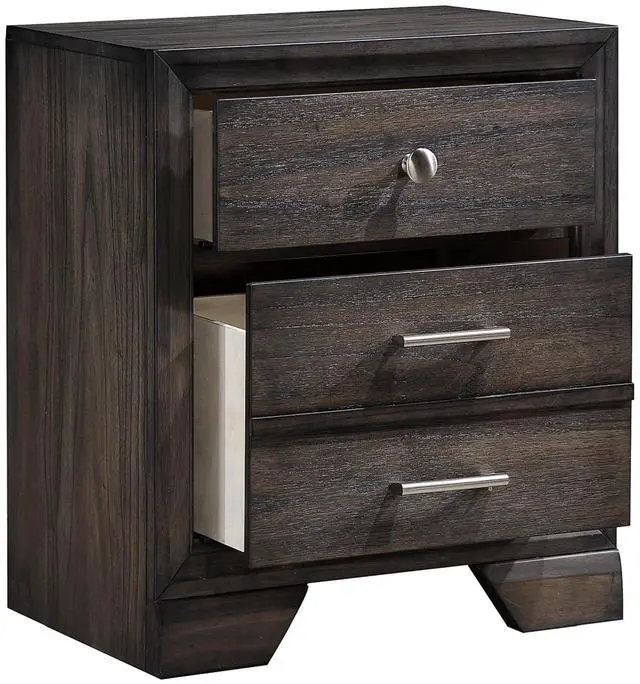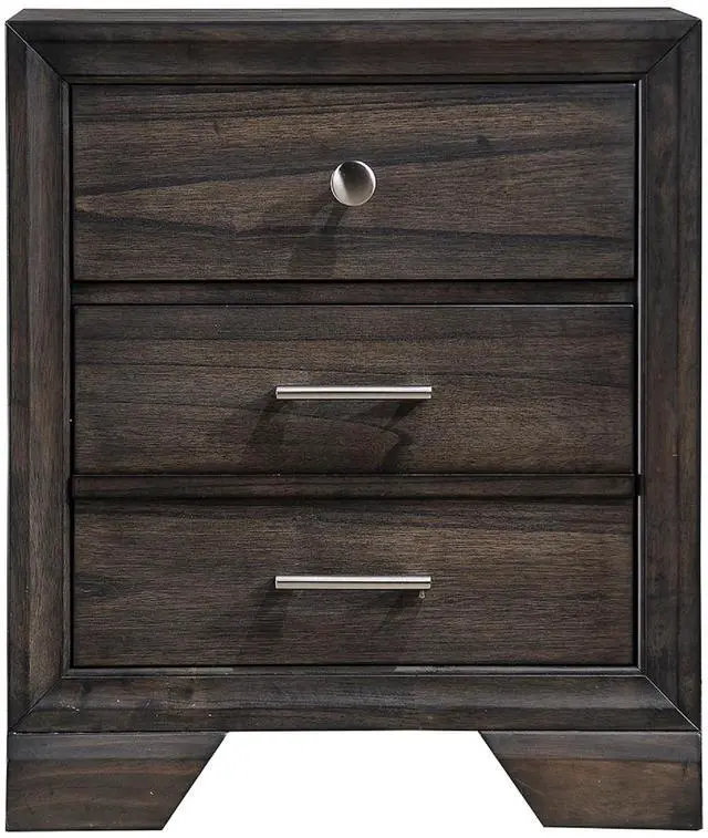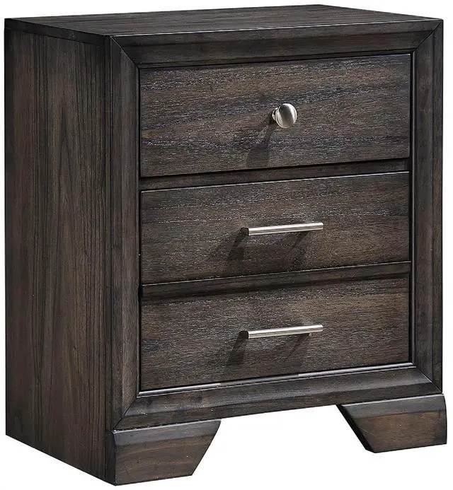 Dimension:Nightstand: 23.6" X 16.3" X 26.5"H Description: With a gorgeous dark wood finish that boasts a vibrant grain, you'll love having this nightstand in your bedroom. The hardware is a combination of metal knobs and handles that provide a visual counterpoint to the finish. As storage goes, you receive three spacious drawers that'll provide excellent space for your clothing and accessories. Listing Include: 1pc Nightstand Only. Simple Assembly Required.