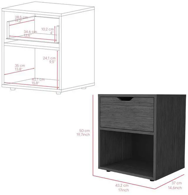 Versatile Storage: Offers an open shelf (15.8"W x 9.5"H) and a discreet drawer (13.6"W x 4"H).