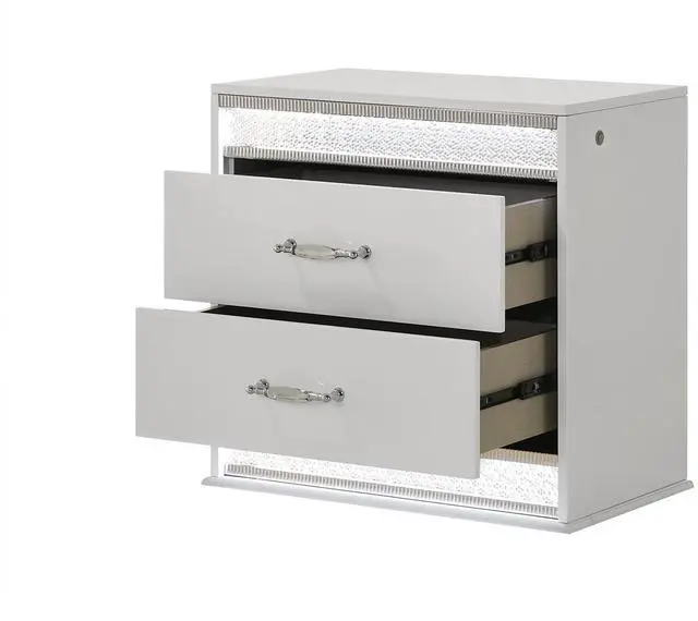 This modern nightstand adds a touch of glam to your bedroom with its sleek high-end lacquer finish and sparkling crystal detailing. Featuring two spacious drawers, the top drawer is lined with luxurious red velvet, offering both style and protection for your valuables. The integrated LED lighting along the edges provides a soft, ambient glow, making the nightstand not only functional but also an eye-catching statement piece. Its clean lines and reflective surfaces, enhanced by the premium lacquer finish, elevate the overall contemporary design, blending practicality with elegance.